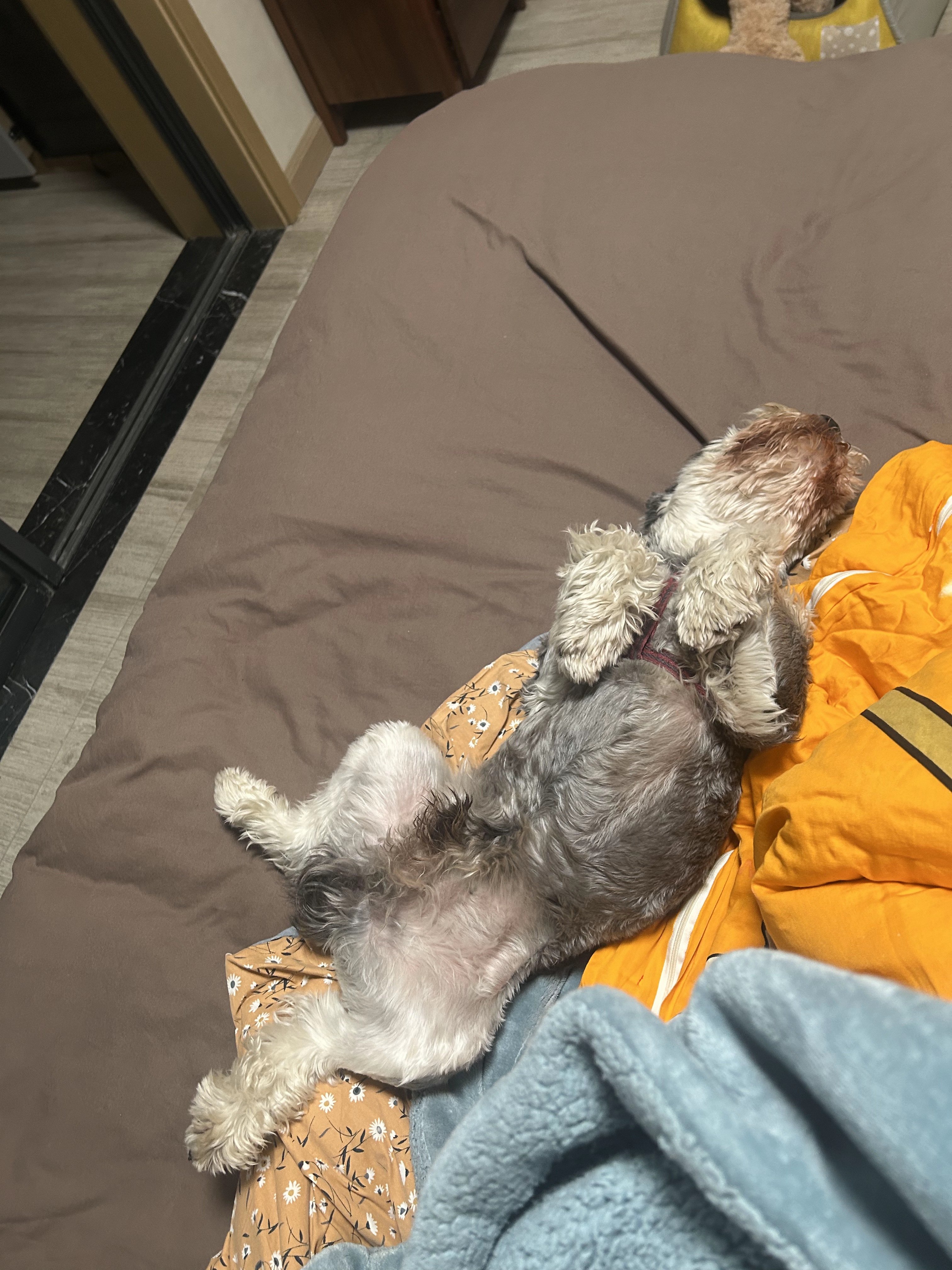 Ethan 不愿待在它的狗窝里,眼巴巴地看着我,那小眼神好像在说:“让我上来嘛~” 我拍了拍床,它搜的一下子就跳上来了。 你看看它,睡的真舒服。狗狗也喜欢面朝上睡觉呀,你看它的前爪,缩起来的样子太可爱了。 我今晚也想像它一样睡觉💤
